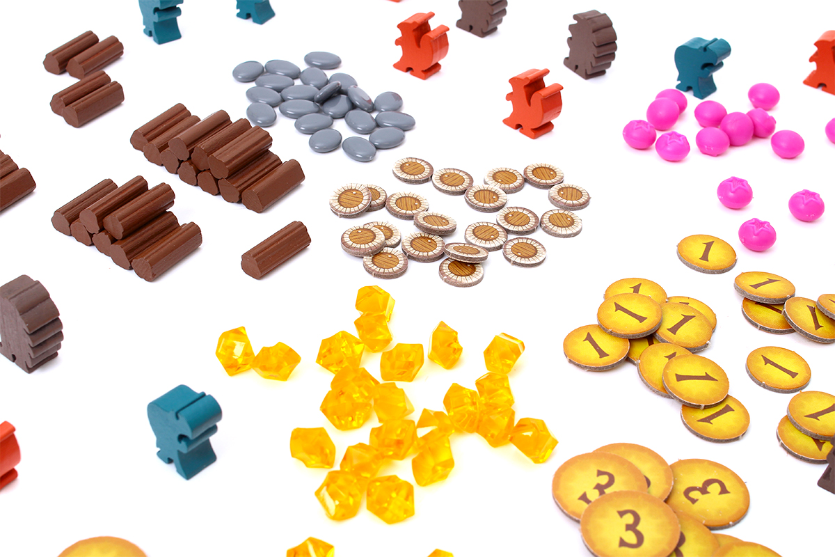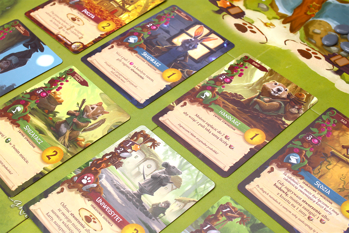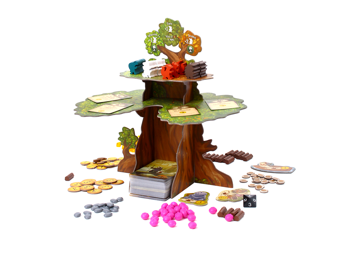 - W grze bardzo ważna jest sfera wizualna. Pole gry przypominające pień drzewa, pieczołowicie zaprojektowane żetony surowców, a do tego grafiki pełne uroczych zwierzątek w przeróżnych konfiguracjach i pomysłowych ujęciach. Kto nie lubi uroczych zwierzątek? 🙂