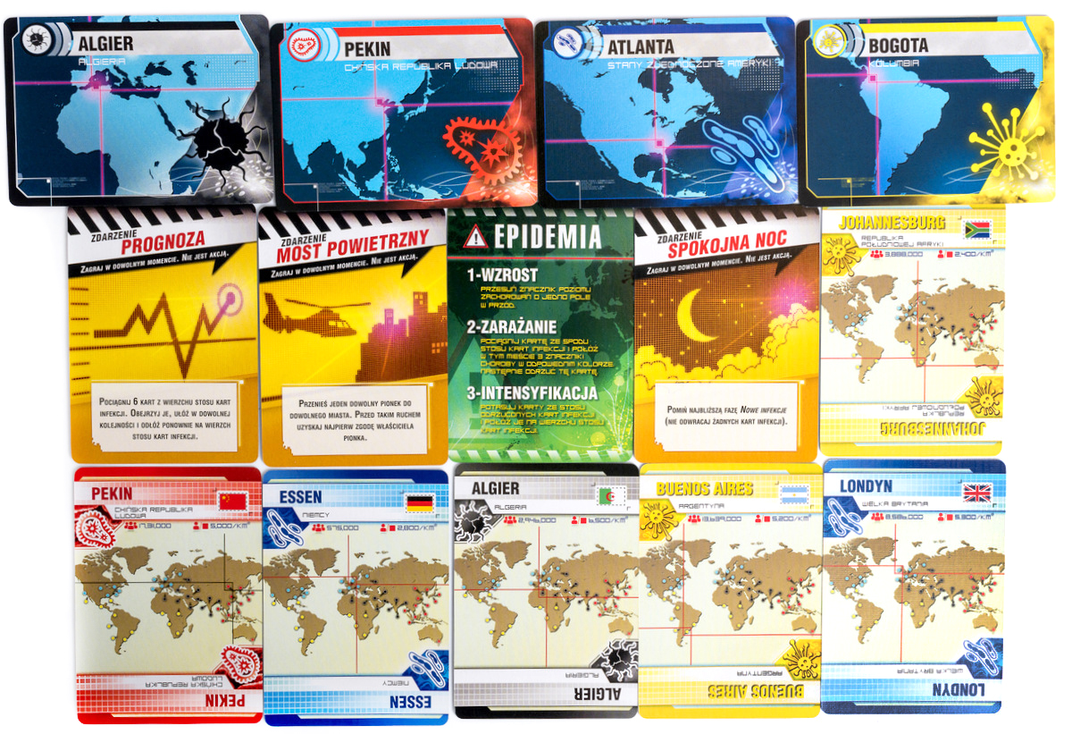 Rozgrywka toczy się na planszy przedstawiającej 48 miast połączonych siecią, a do dyspozycji graczy są dwie talie kart – „Player” i „Infection” – oraz cztery kolory kostek chorób, pionki specjalistów, stacje badawcze i karty działań. Każda tura składa się z faz akcji gracza (np. leczenie, podróże, budowa), dobierania kart i infekowania nowych miast, z rosnącym poziomem zagrożenia wyrażonym liczbą „epidemii” .
