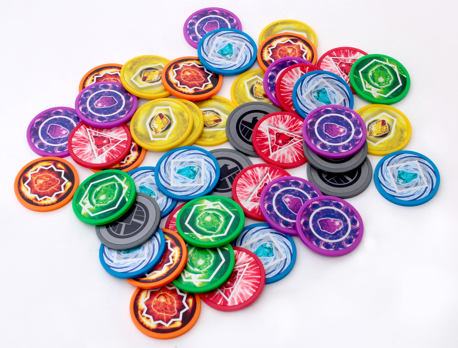 - Zielony Kamień Nieskończoności. Jego symbol znajduje się na każdej karcie poziomu 3. Gdy gracz werbuje pierwszą postać z tym symbolem, bierze zielony znacznik. Jest on niezbędny, by pozyskać Rękawicę Nieskończoności, co oznacza, że aby wygrać, należy mieć w swoich zbiorach przynajmniej jedną kartę 3 poziomu.